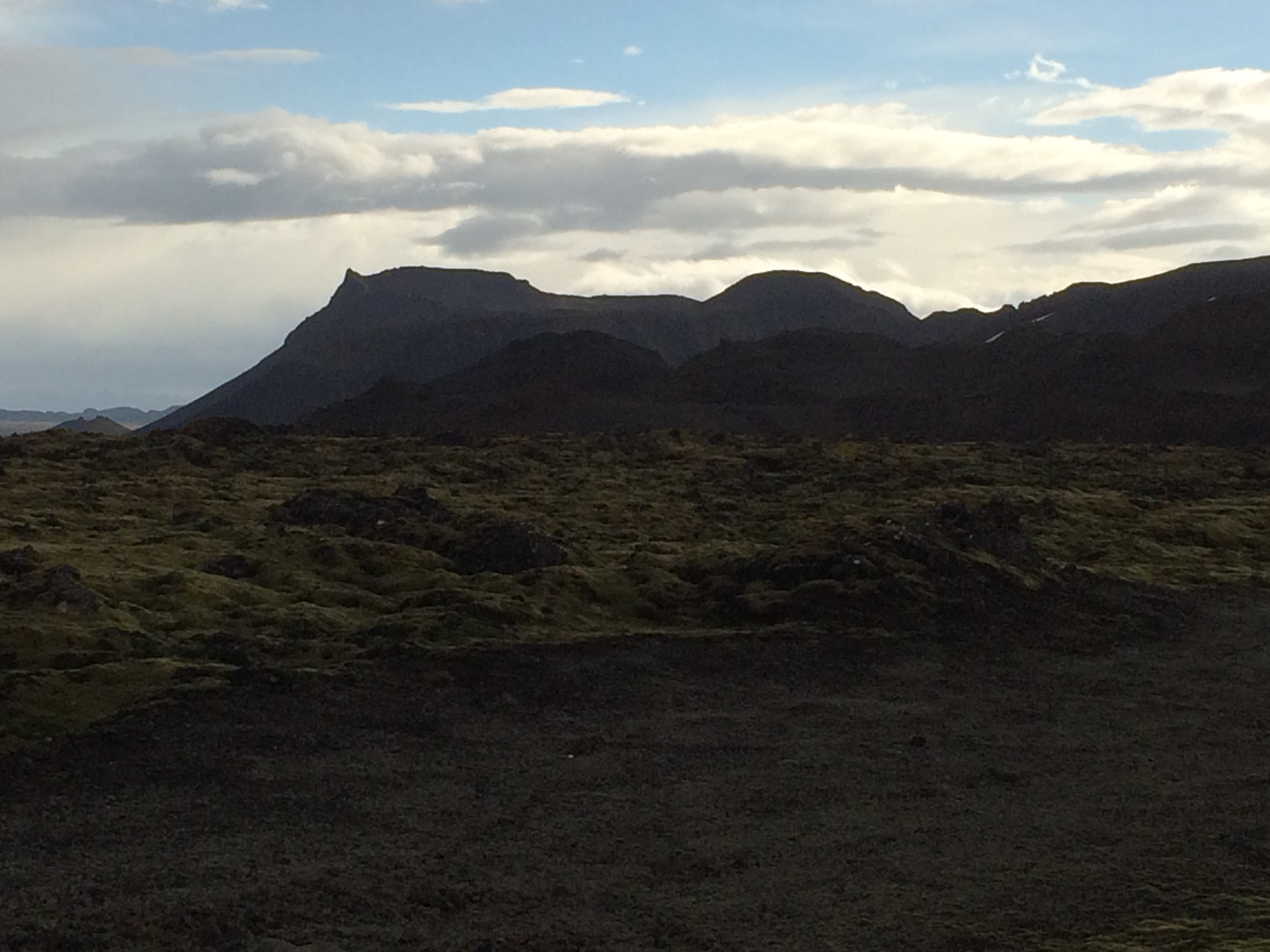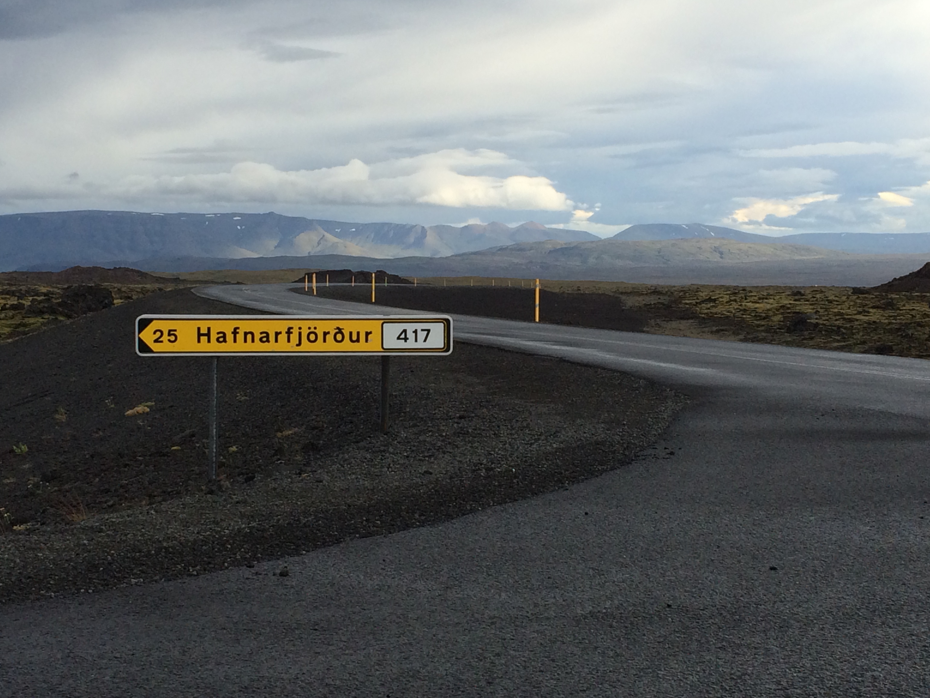 I dropped ST at the airport for an earlier flight than mine but had a few extra hours in country. I decided to see the waterfall you can walk behind, Seljalandsfoss. But to get from Keflavik back to Rt 1, you either have to go up to Reykjavik again or you can take a shortcut through Rt. 417 that drops you out on Rt 1 and saves you about 30 km of driving. Anyone who knows me knows I picked the shortcut. It was both glorious and terribly ill-advised. It turns out Rt 417 is unpaved — so you hop off Rt 41 at the City of Elves (I am not making this up – it’s just north of the City of Vikings) to pick up 417. Signs in Iceland have the road to which you’re eventually connecting highlighted with dotted lines instead of solid, which is not as helpful as you’d think. They don’t tell you how far away said connection is or its condition. Anyway, I toodle along on the connector road and turn onto 417 to discover it is volcanic-rock gravel. Funny things about volcanic rock: it’s crazy sharp and strange to drive on. And after an unfortunate flat tire in a rental car in Scotland last year, you can safely call me gun-shy about getting another one in a foreign land. But, life is very short. So, rationalizing the gravel might be temporary (spoiler: it wasn’t), I proceeded. The scenery on 417 was amazing — a little like I imagine driving on the moon would be, but surrounded by beautiful, bright-green-moss-covered hills and mountains.