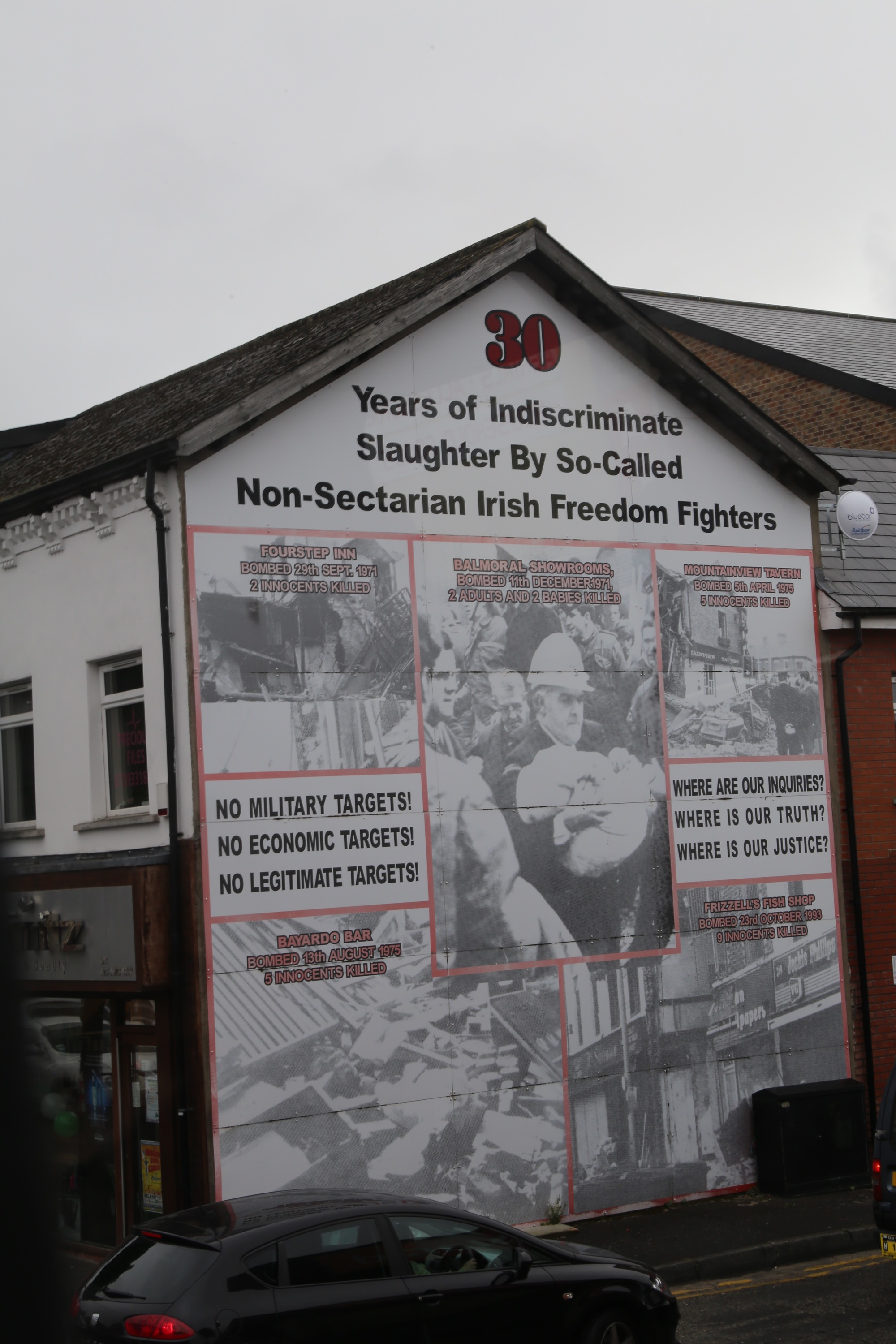 The entrance to the Europa Hotel near City Centre. A rather graphic mural on the Shankill Rd identifying losses suffered over the course of the Troubles.