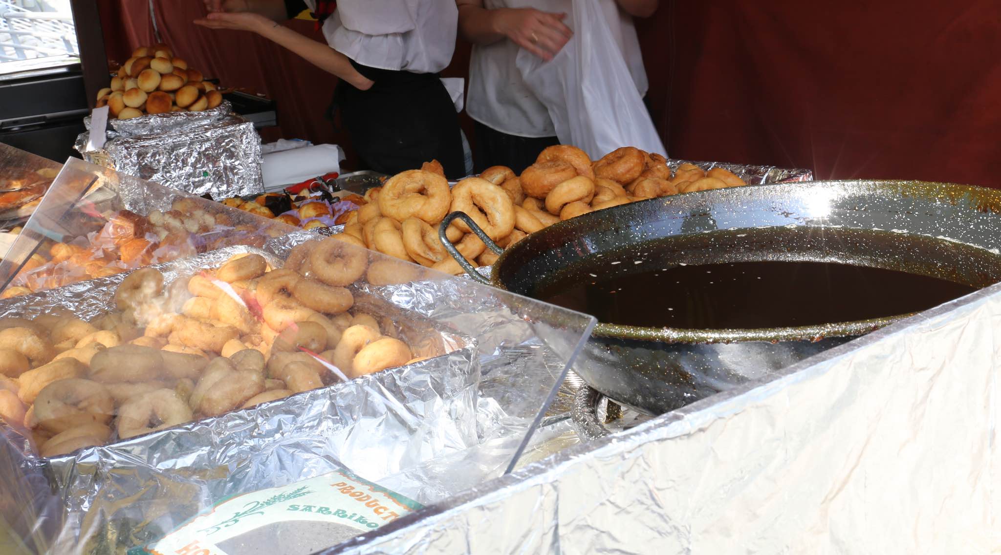 The Cathedral of Salvador is just across the square from the Basilica. The cube in front is part of a museum. Dual lions at the bridge across the Ebro River The street food at the festival was delicious, including these anise-flavored donuts. The Offering of Flowers is a key part of the festival, resulting in this pyramid in the middle of the square.
