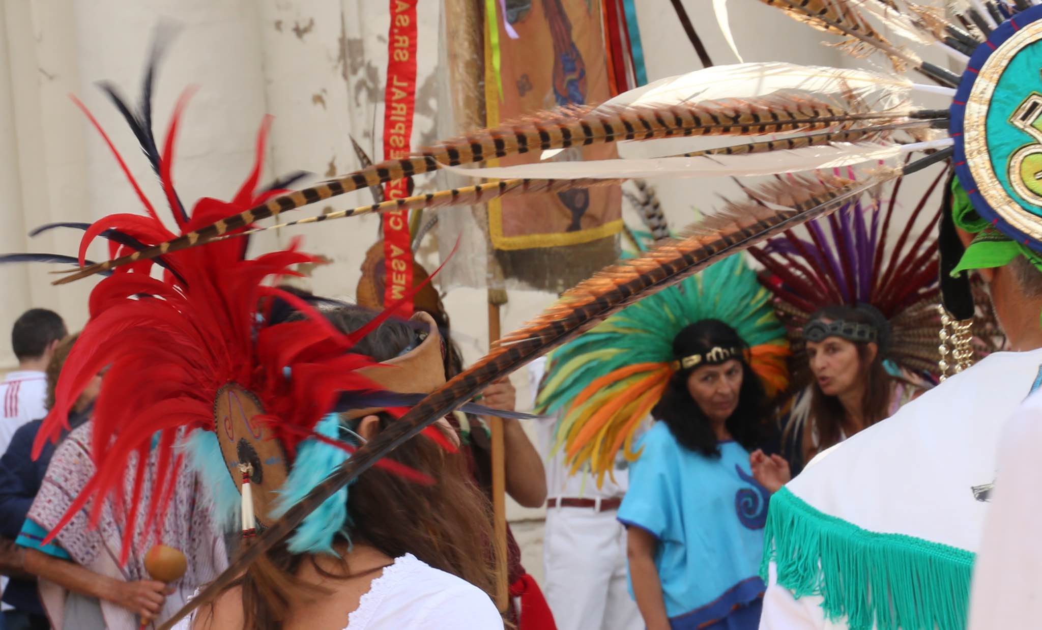 Basilica de Nuestras Señora del Pilar with the flower pyramid from the festival Festival dancers Festival dancers Festival dancers Festival dancers – they were all decked out in feathers as native peoples of the Americas. Festival dancers Each of the festival dancers was wearing their own percussion.