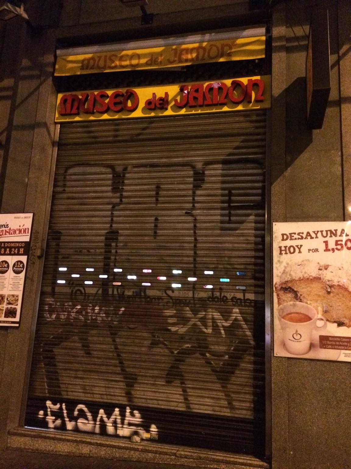 This title quote is misleading. In fact, this entire post might be misleading. I was in Madrid for about 12 hours, and it rained for a third of those (you’re welcome: no rain-in-Spain quotes), so I did no “killing of the night.” What I did see of the biggest city in Spain and her capital is beautiful. Our bus pulled into Madrid in early evening just as the sun was going down. Aside: time is weird in Spain – every activity is later than anywhere else I’ve been (i.e., lunch at 2, dinner at 9, etc.). And the actual hours are off – geographically they should be on Greenwich Mean Time, but they are on German time instead. Franco changed it in 1940 to be like the Germans, and it never got changed back. So sunrise is like 9 AM. /aside