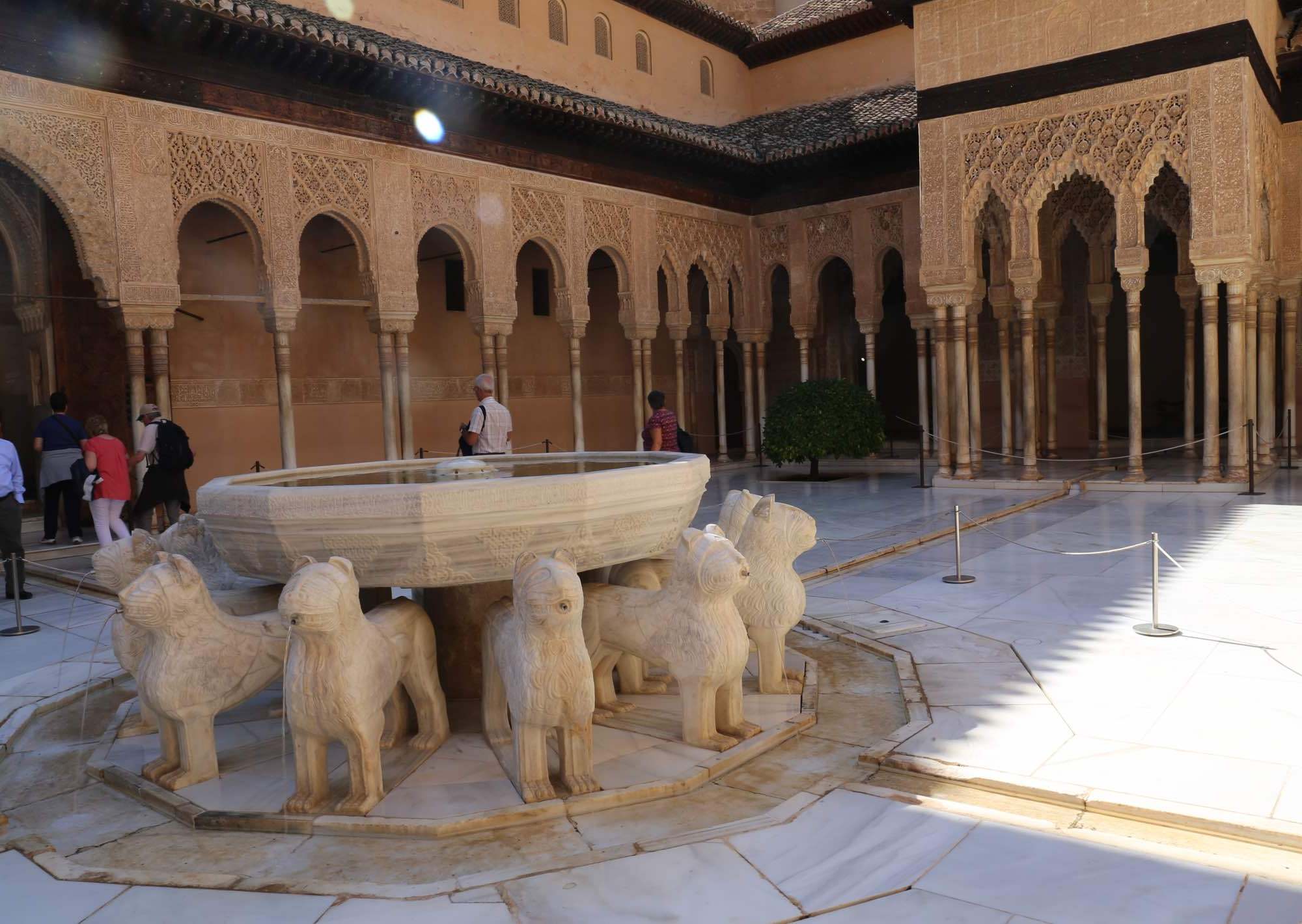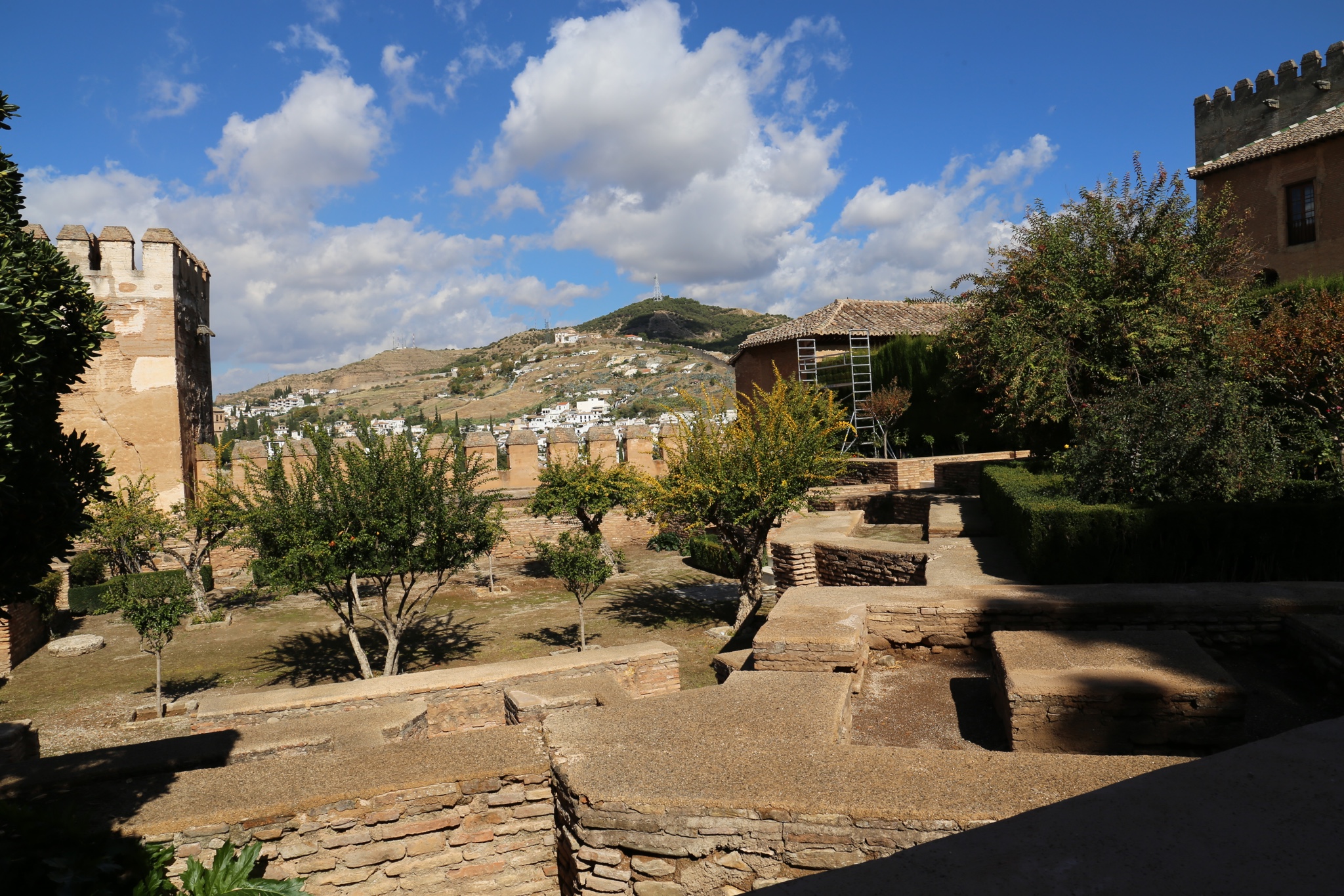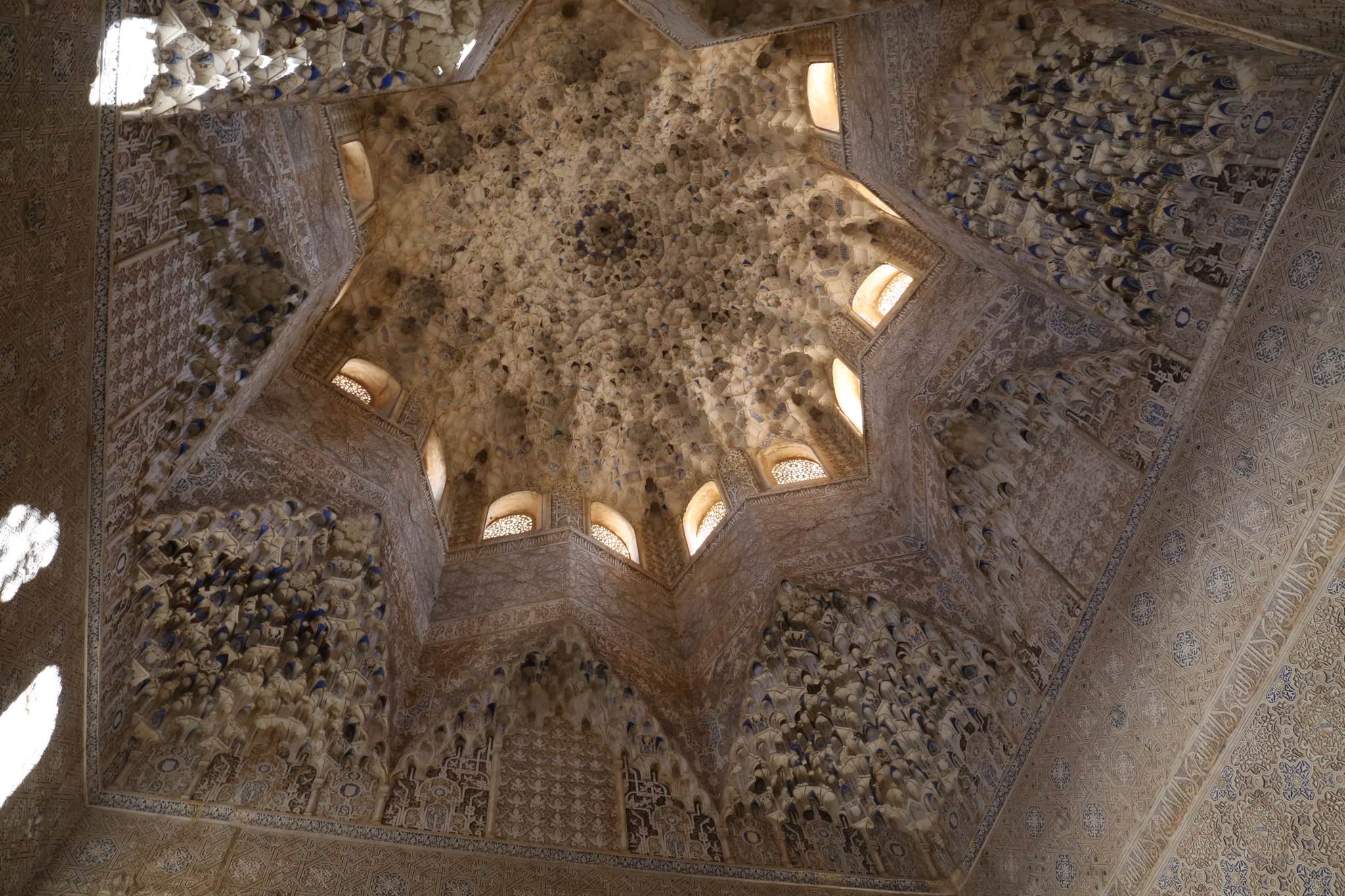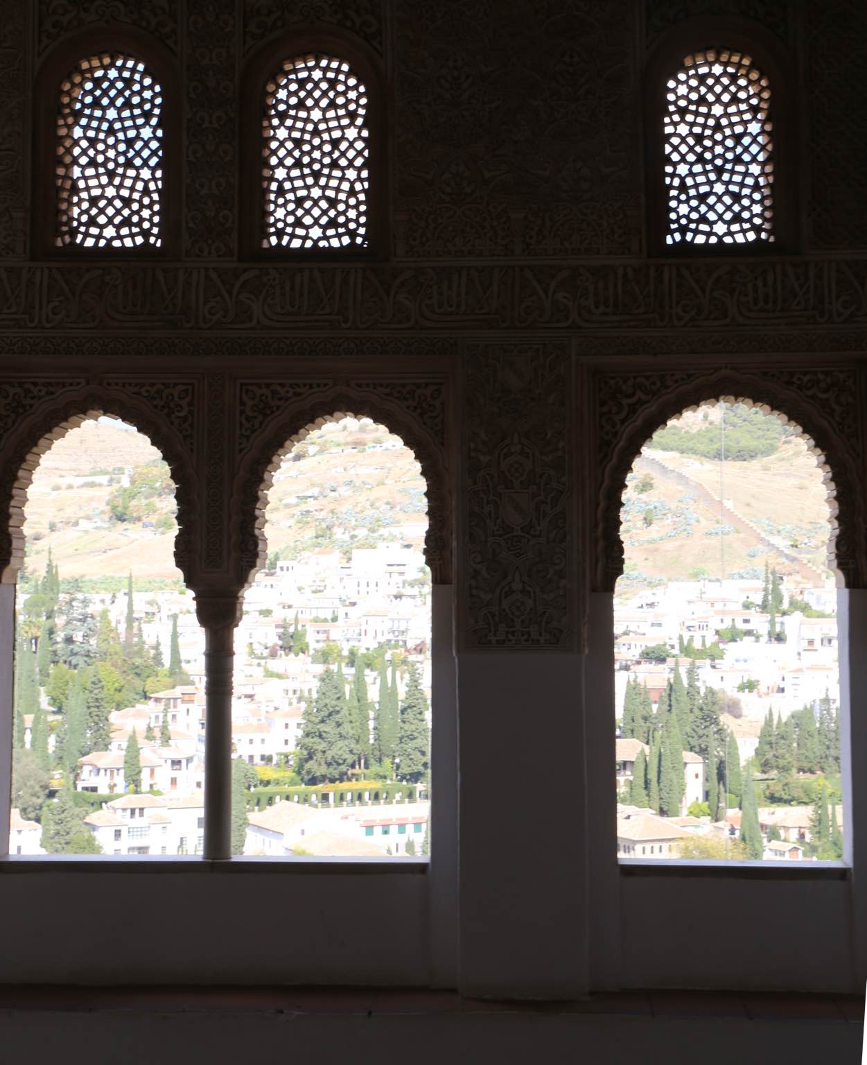 Ruins of a palace or other buildings in the courtyard between the Renaissance Palace and the Nasrid PalaceArches on the outer edge of the Court of LionsThe carvings are done in plaster – it’s kind of amazing they’re in such good condition.Arabic language as part of the decorStalactite ceiling in the Nasrid PalaceOne of the balconies in the AlhambraOne of the courtyardsElaborate windows look out over a green courtyardFrom these windows you can see Granada and the Sierra Nevada mountainsThis is the Throne Room where the sultan would have heard petitionersThe Court of Lions honors the three religions of the people: arranged as a Christian cloister with Arabic writings and decor, and the 12 lions in the middle represent the 12 tribes of IsraelDetail on one of the columns in the Nasrid PalaceView of Granada from one of the Alhambra’s balconiesThis alcove has the last remaining piece of original stained glass. At one time, the palaces would have been lousy with the stuff.Just one section of the Alhambra gardensThis persimmon tree graces one of the gardens at the AlhambraA beautiful tree in the main courtyardExterior of the Renaissance Palace added by Charles VPart of the Renaissance Palace added by Charles V