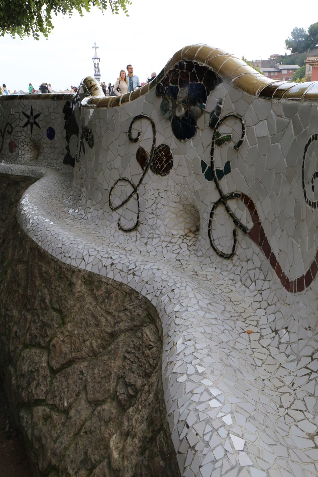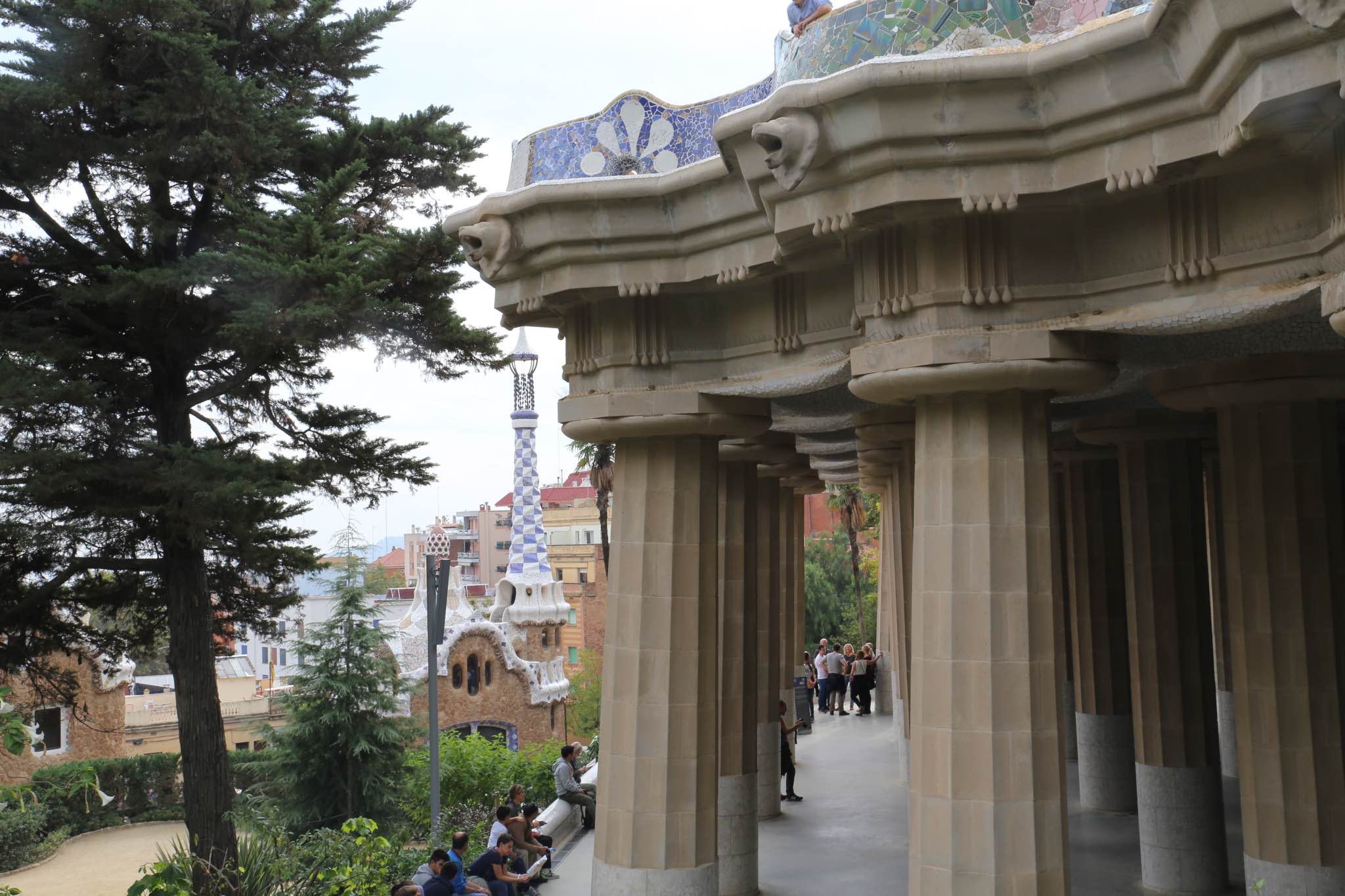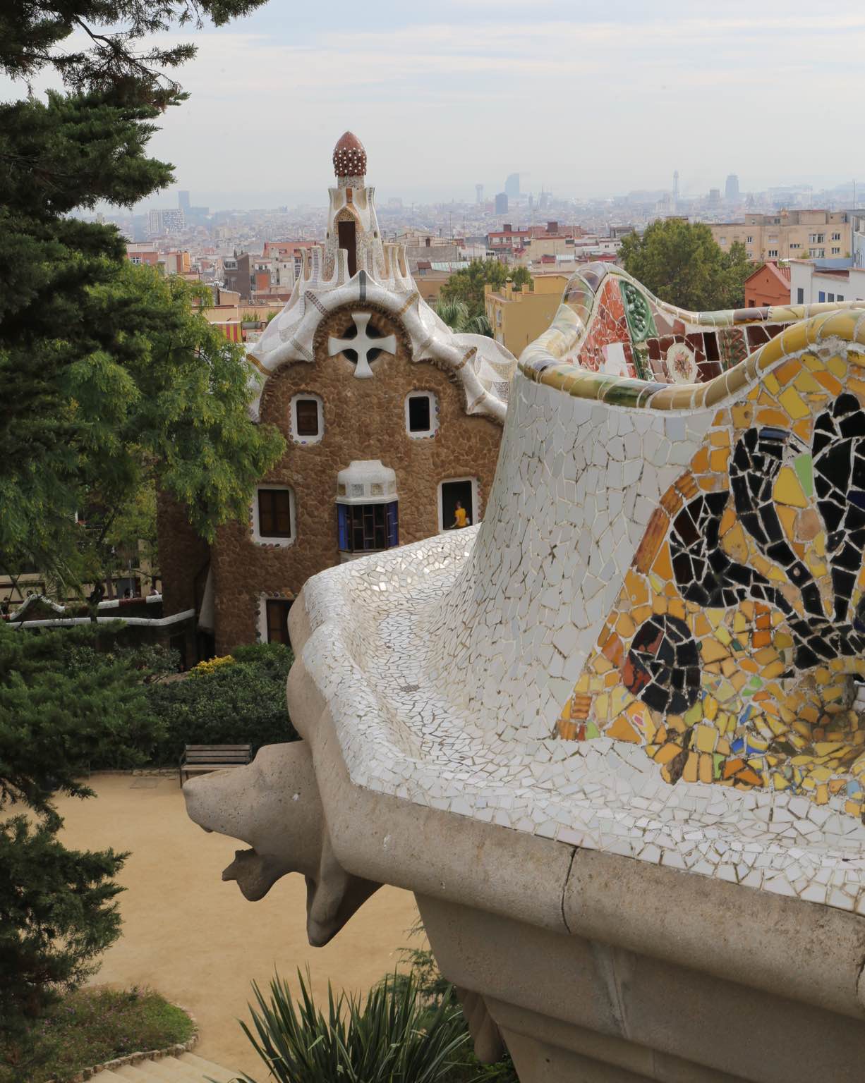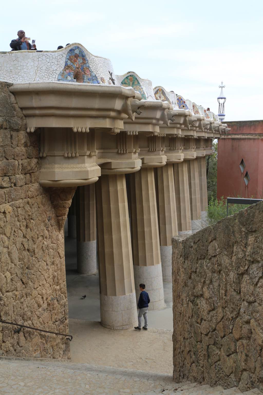 Detail of the benches at the top of the Monumental sectionStairs lead down from the top part of the Monumental section into this columned areaThe top of Gaudi’s house at the parkGift Shop at the ParkThe column section is covered in white broken-ceramic mosaics… it’s a stark place.Column area from the frontThe various mosaics catch the light in a way a single sheet of ceramic wouldn’t.I’m not sure which animal this is, but he’s clearly Spanish… or Catalan… OK, details are scarce all around.Mosaic detail – the patterns and colors are extensiveEach ceramic section made me wonder what the original pieces were before they were used in Gaudí’s workTunnel at the Park.This staircase in the free section of the park leads up to the hills above and great views of the cityDetail of the catacomb section in the free part of the ParkThe top edge of the Monumental section with the outer edge of the benches that go around the topMore ceramic details from the outside of the benchesView of Barcelona from the Park GüellView of Barcelona from the Park GüellAnother detail of Gaudí’s home at Park GüellStairs lead down from the top part of the Monumental section into this columned area