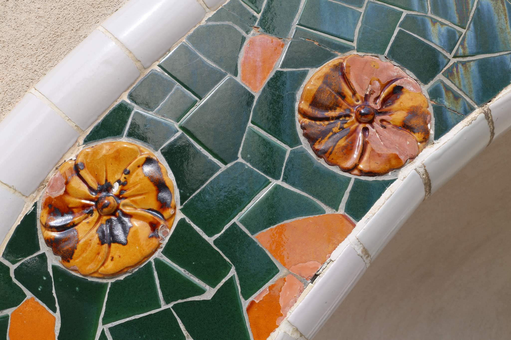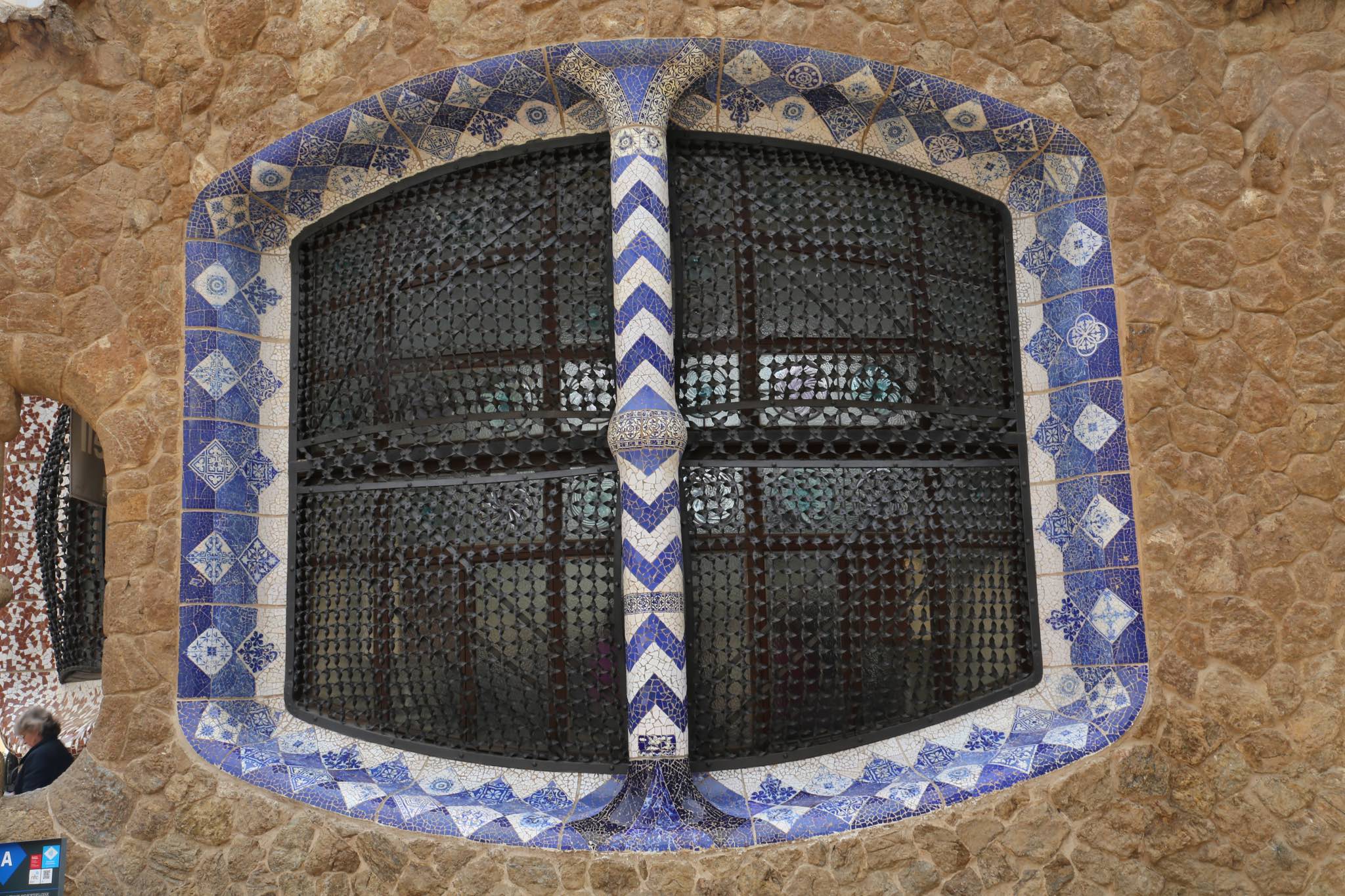 Window in one of the houses at Park Güell.Detail of the pansy mosaic at the top of the main stairs