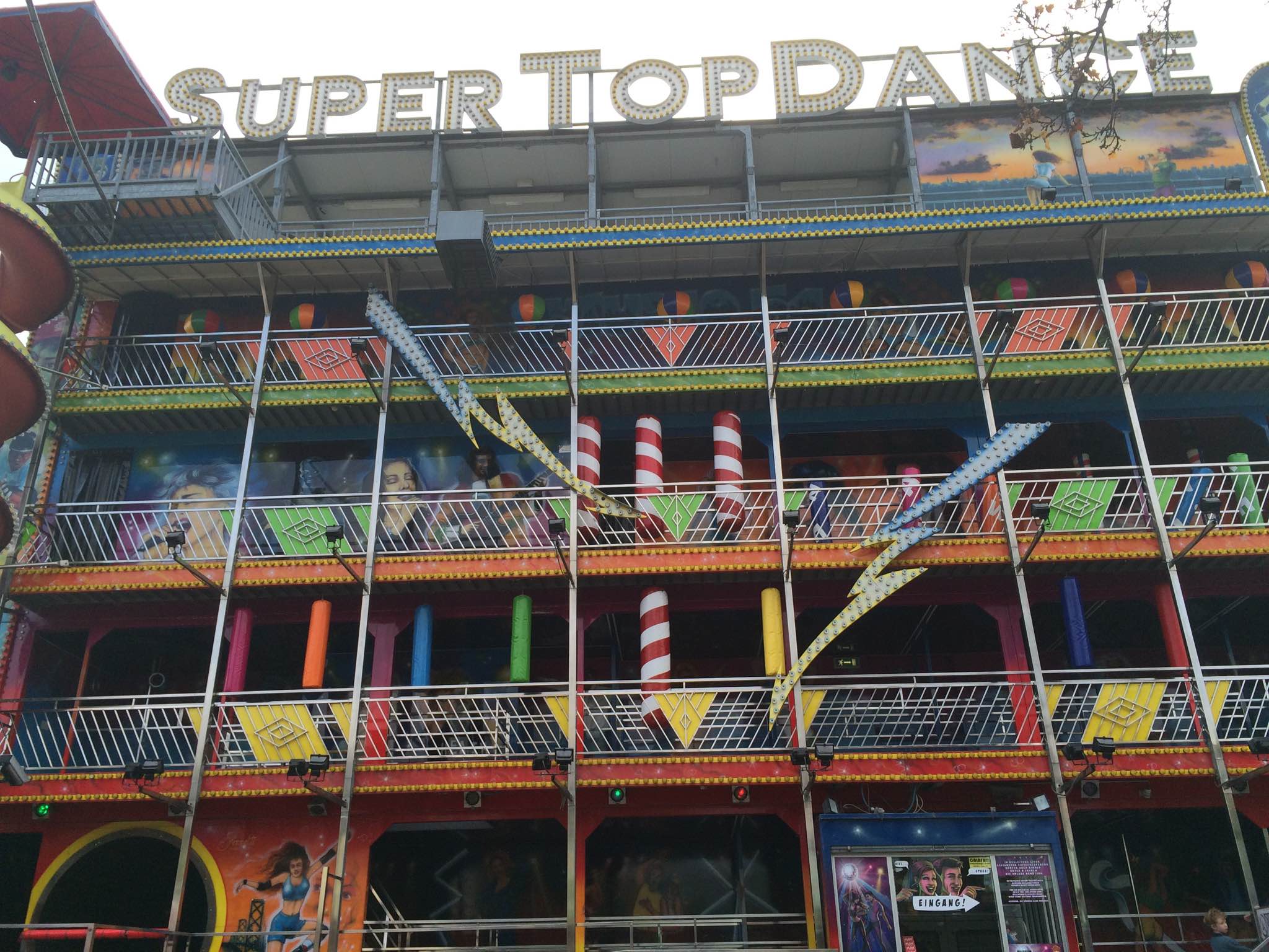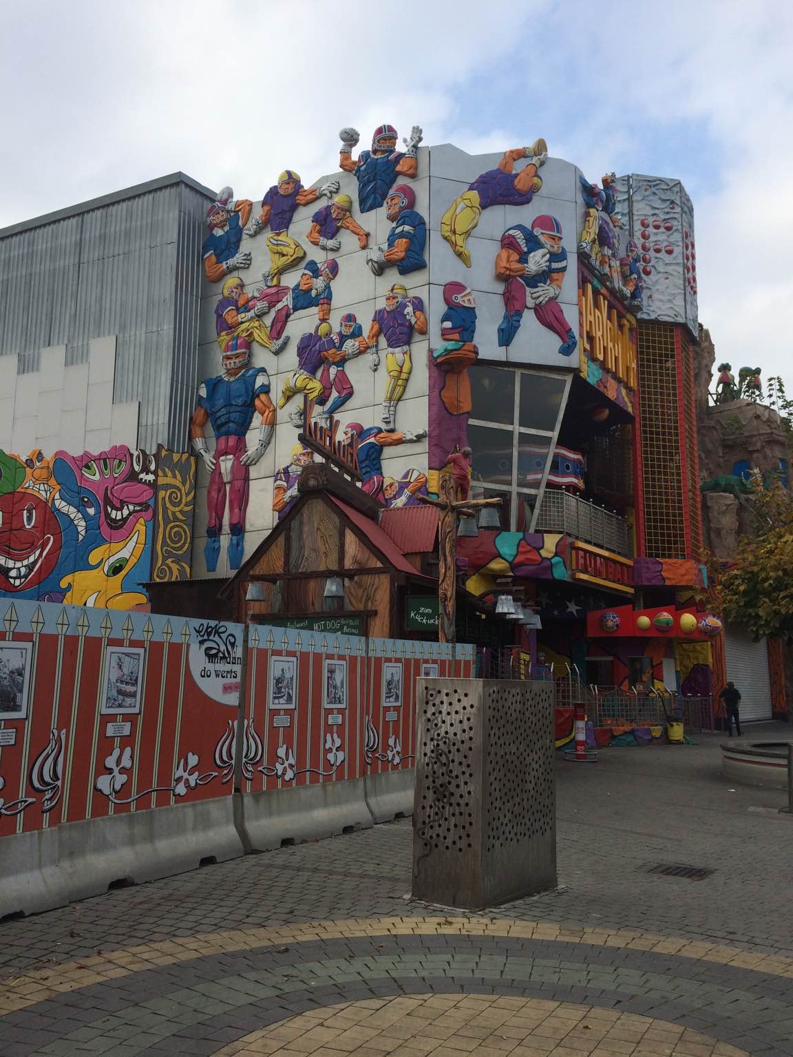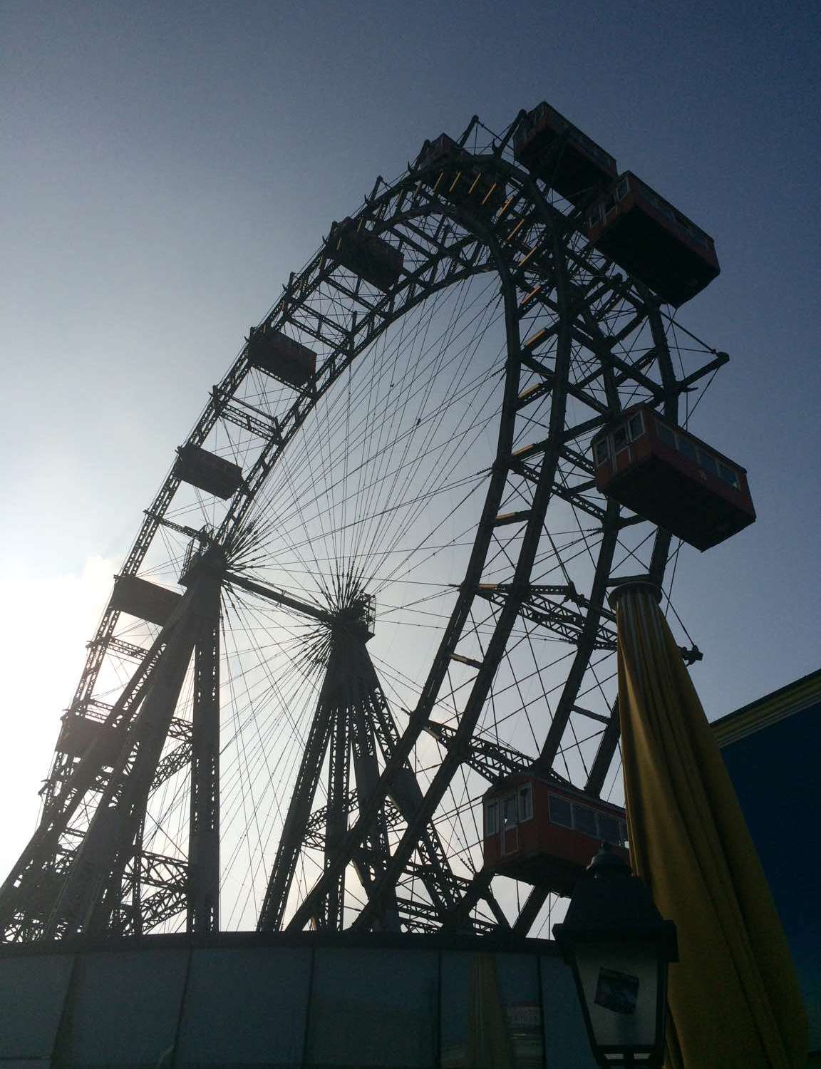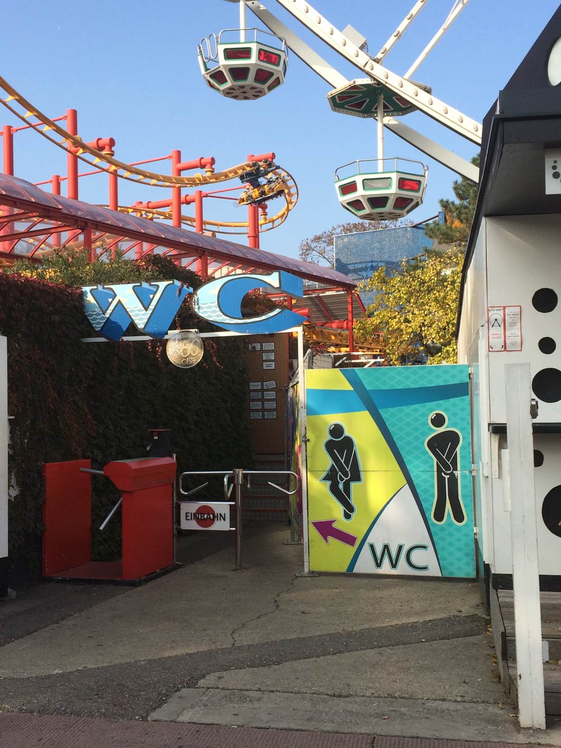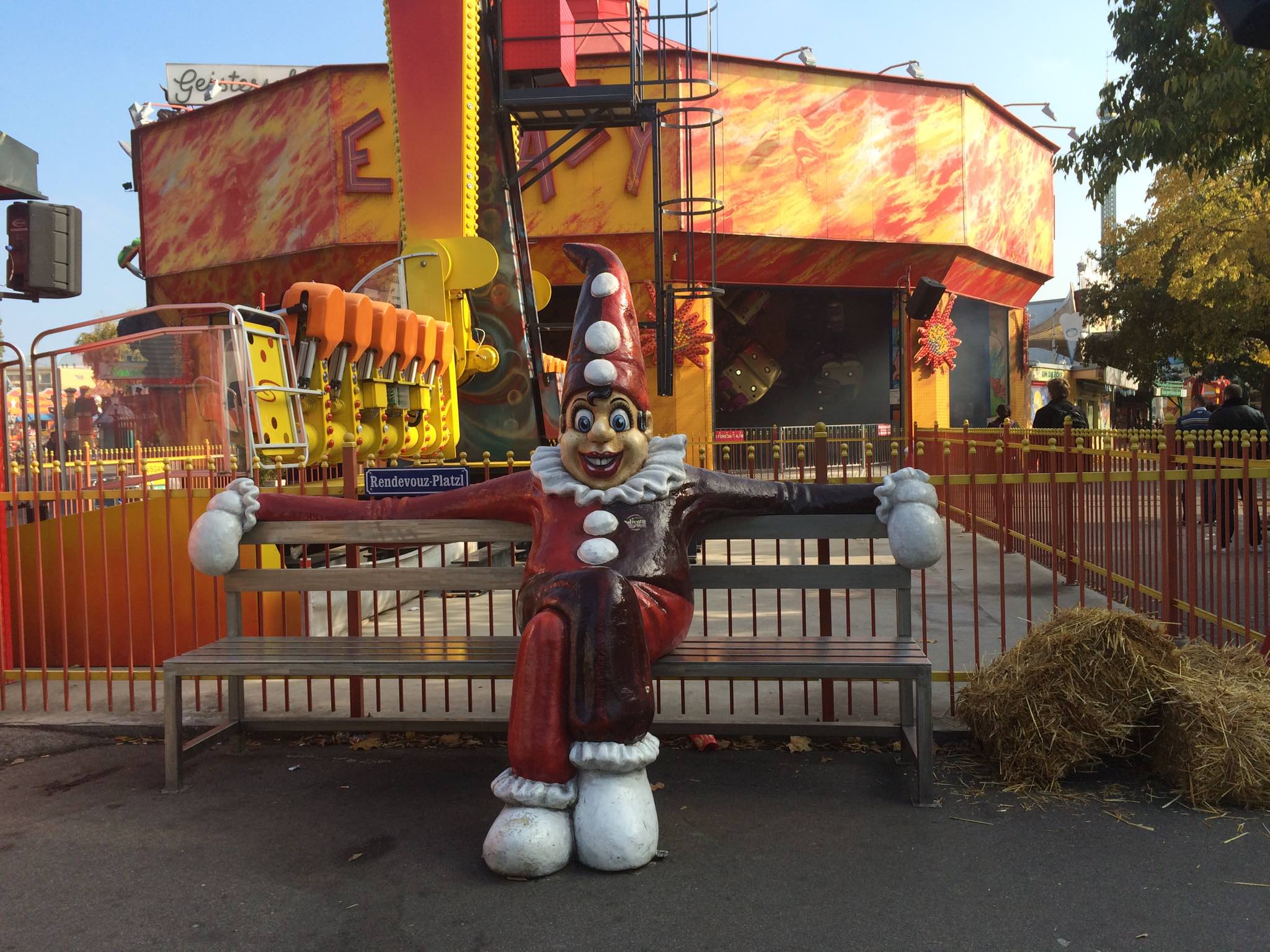 The famous ferris wheel: the ReisenradPrater ParkOn this ride, you ride on your belly, and it launches you like a rocket, head-first.The smaller of the two ferris wheels at the PraterHaunted House/Fun HouseThis guy is holding up the corner of a haunted house/fun house.A rather terrifying scarecrowThis water ride looked a little insane – mostly because you would be freezing if you got wet here.This ride played German techno music crazy loud, and check out the art behind the ride.Best WC/restroom signs everThese giant statues turn.The Prater version of the teacup ride.From a distance, these statues look like real people standing there, especially after dark.Statues near the kids’ section of the parkThe most terrifying ATM in the world.A dance-themed fun house that seemed kind of like it was encouraging pole dancing.Always with the clowns…Prater ParkFootball, American style. The “ride” is a fun house.Spinning Sombreros!Another of the fun housesPrater Park