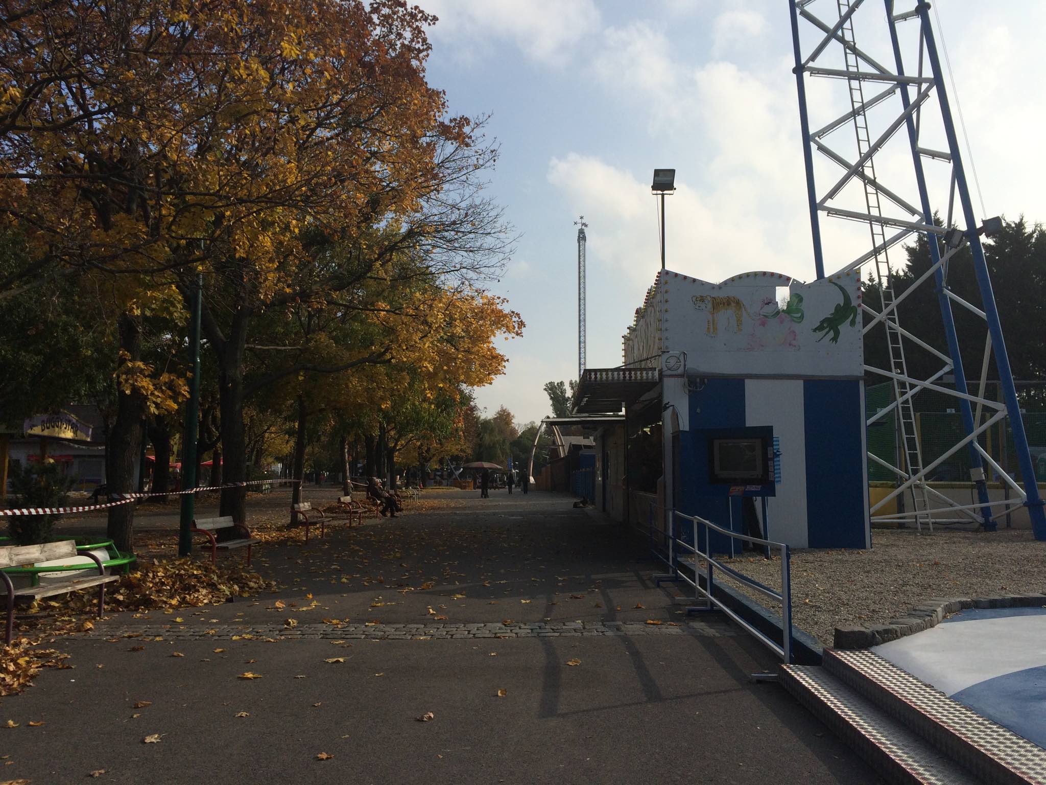 My apartment is near the Wurstelprater, an amusement park in the city of Vienna, simply called Prater. It boasts the famous ferris wheel, the Riesenrad. NM, TN and I had some extra time between classes, so we took a walk through the Prater to enjoy the fall color and explore the park one afternoon. It’s an intriguing place – it offers a combination of Six-Flags-caliber rides with county-fair-level fun houses. Some of the themed rides in particular were on the cheesy side, though I wasn’t entirely sure how ironically to take the spinning sombreros ride, for instance. There was also inexplicably a North-American-football-themed fun house with some burly footballers. Enjoy the photos and draw your own conclusions.