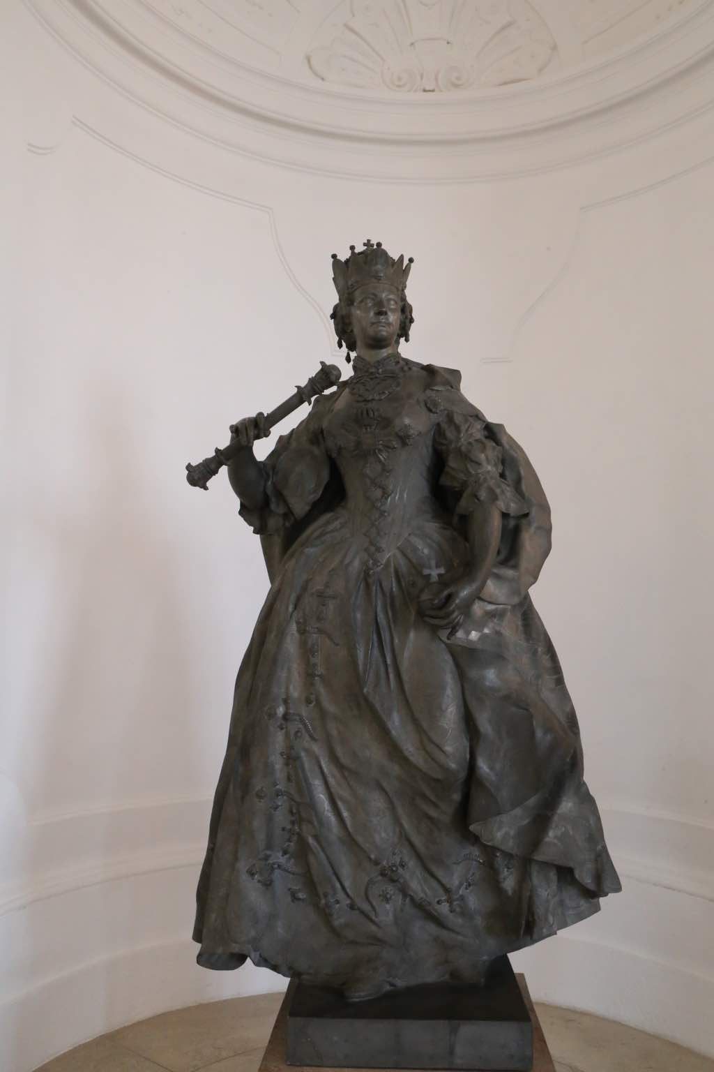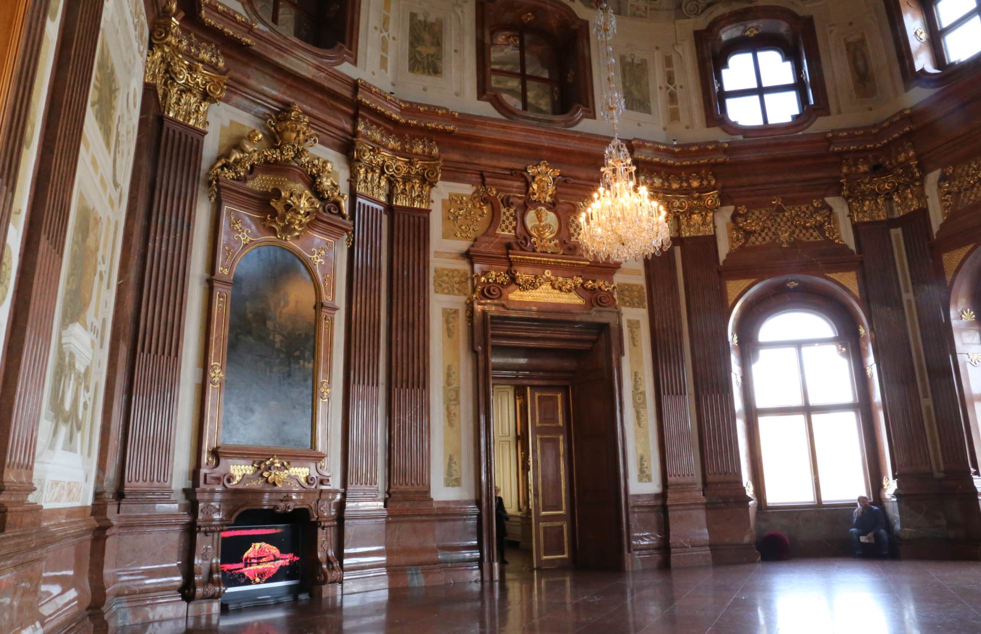 Bas-relief on one of the walls in the Upper Belvedere staircaseMaria Theresa statue inside the Upper Belvedere PalaceMore sculptures holding up columns, this time close to the ceilingUpper Belvedere staircaseMarble Hall in the Upper Belvedere Palace. The inexplicable frog in the fireplace on the lower right ribbeted occasionally.Marble Hall in the Upper BelvedereMarble Hall in the Upper Belvedere PalaceAn ostrich painting seems an odd choice for a military tactician’s home.Gnocchi special at the Upper Belvedere CafeUpper Belvedere Cafe with Empress Sisi paintingDetail of the Upper Belvedere PalaceHorse sculpture at the Upper Belvedere