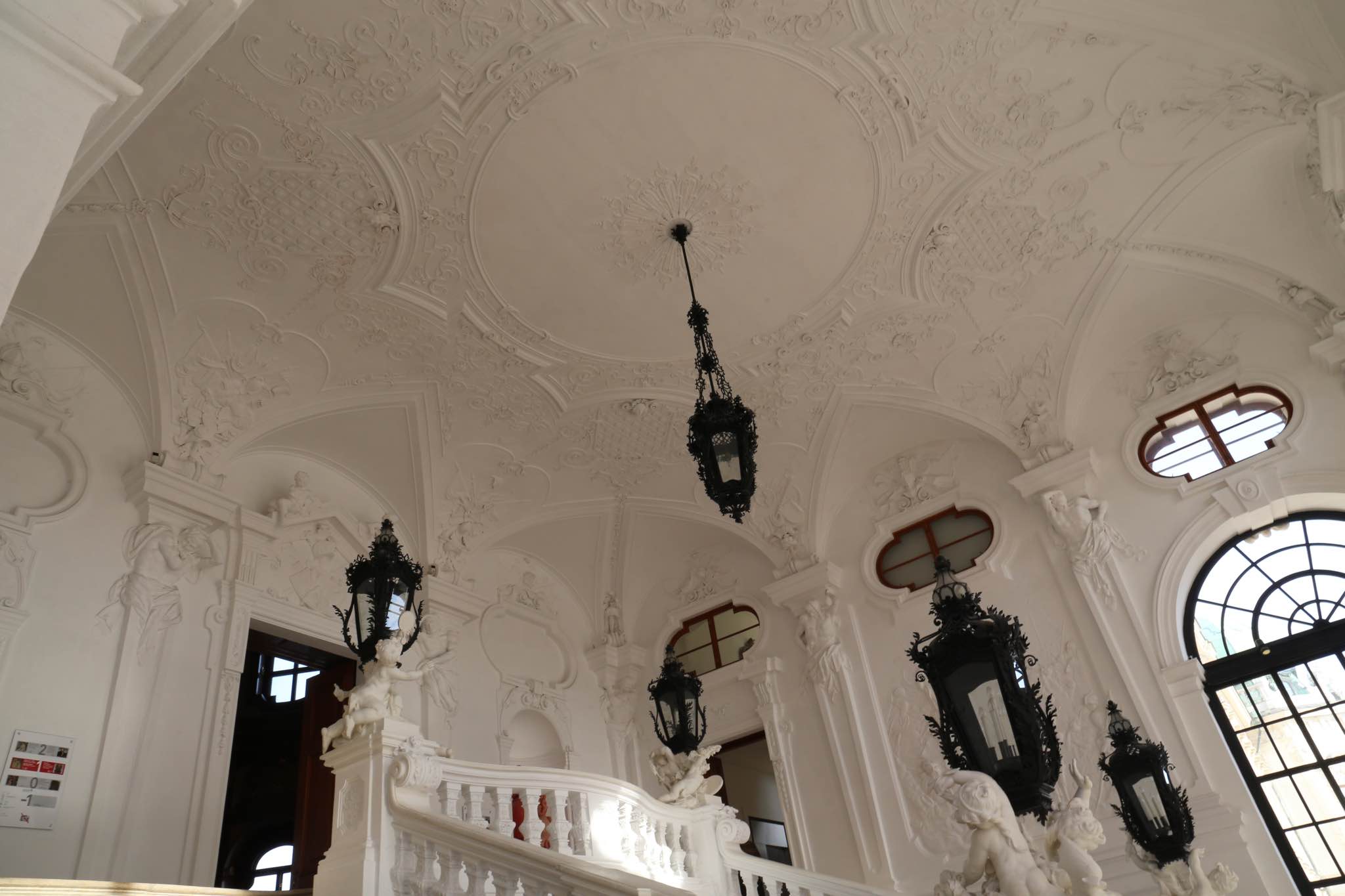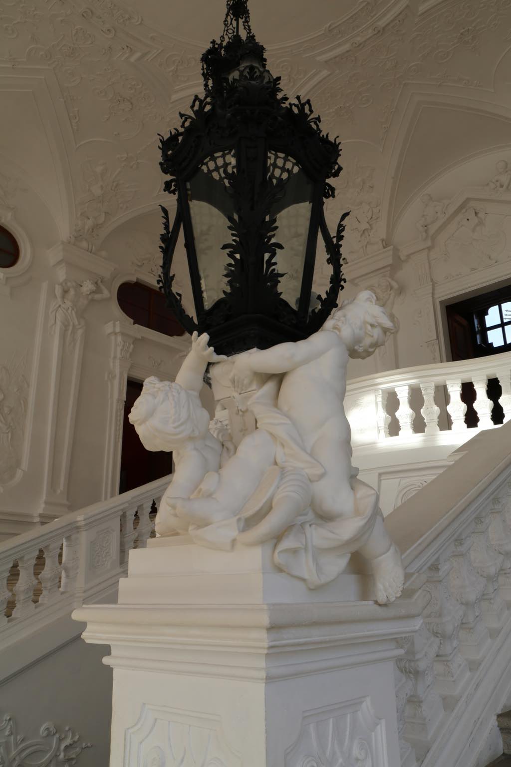 All of the columns are held up by magnificent sculptures who look none too happy about it.Cherubs in the entryway staircase at the Upper BelvedereUpper Belvedere staircaseUpper Belvedere staircase galleryUpper Belvedere staircaseCherubs in the Upper Belvedere staircase