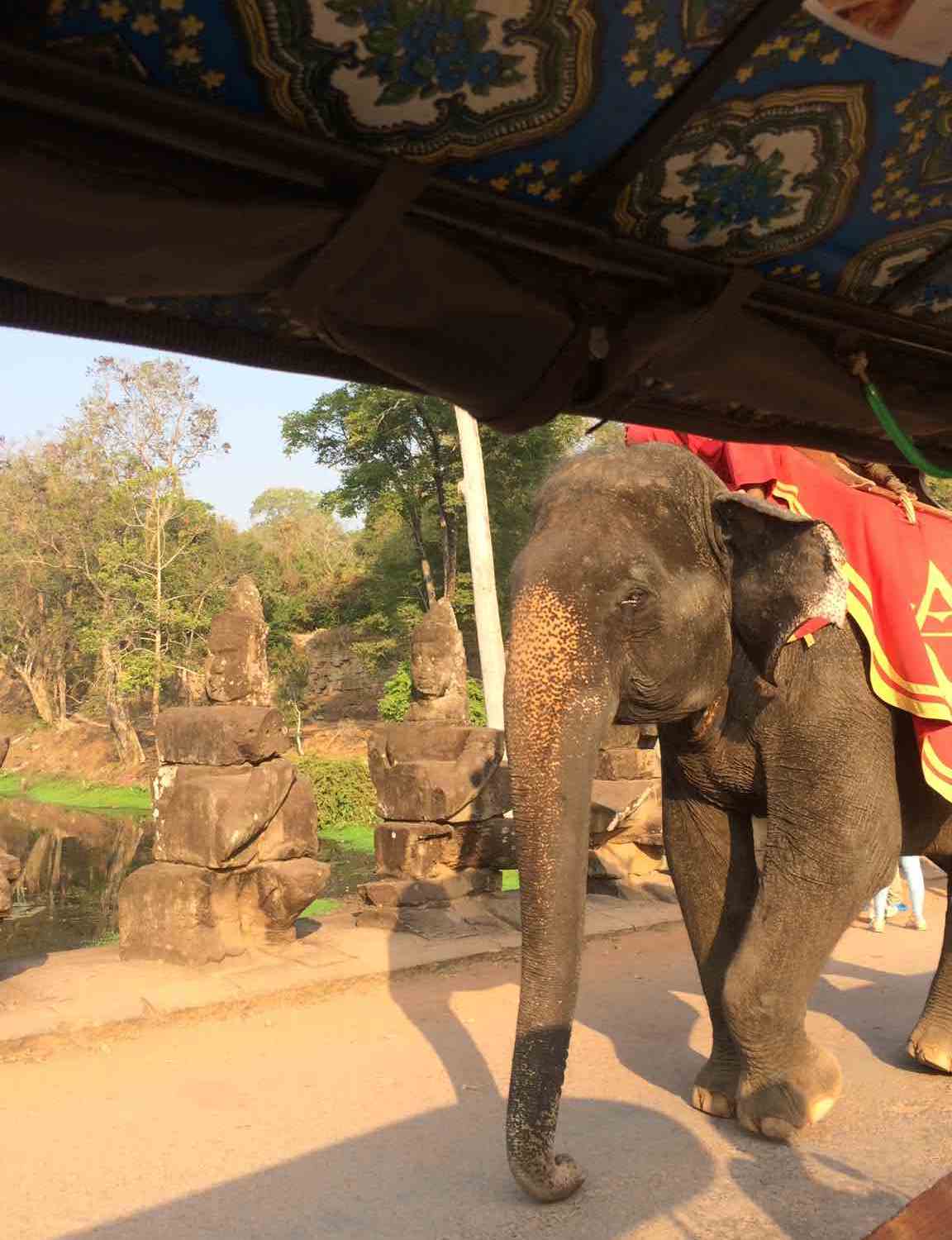 As we left Bayon, we saw lots of elephants ringing the temple, providing rides for tourists. I’m not an elephant expert, but my understanding is that riding the elephants is not good for them. Definitely the little benches they use are supposed to be particularly bad. Full disclosure: ST and I rode elephants bareback in Thailand (another story for another post). You definitely see elephant ride options all over Thailand and Cambodia. But there are also lots of true elephant conservation places that provide a safe place for elephants who have been mistreated – they will let you help take care of the elephants without riding them. I haven’t done this myself, but I understand it’s a good thing to do if you’re keen to see some elephants in a way that doesn’t exploit them.