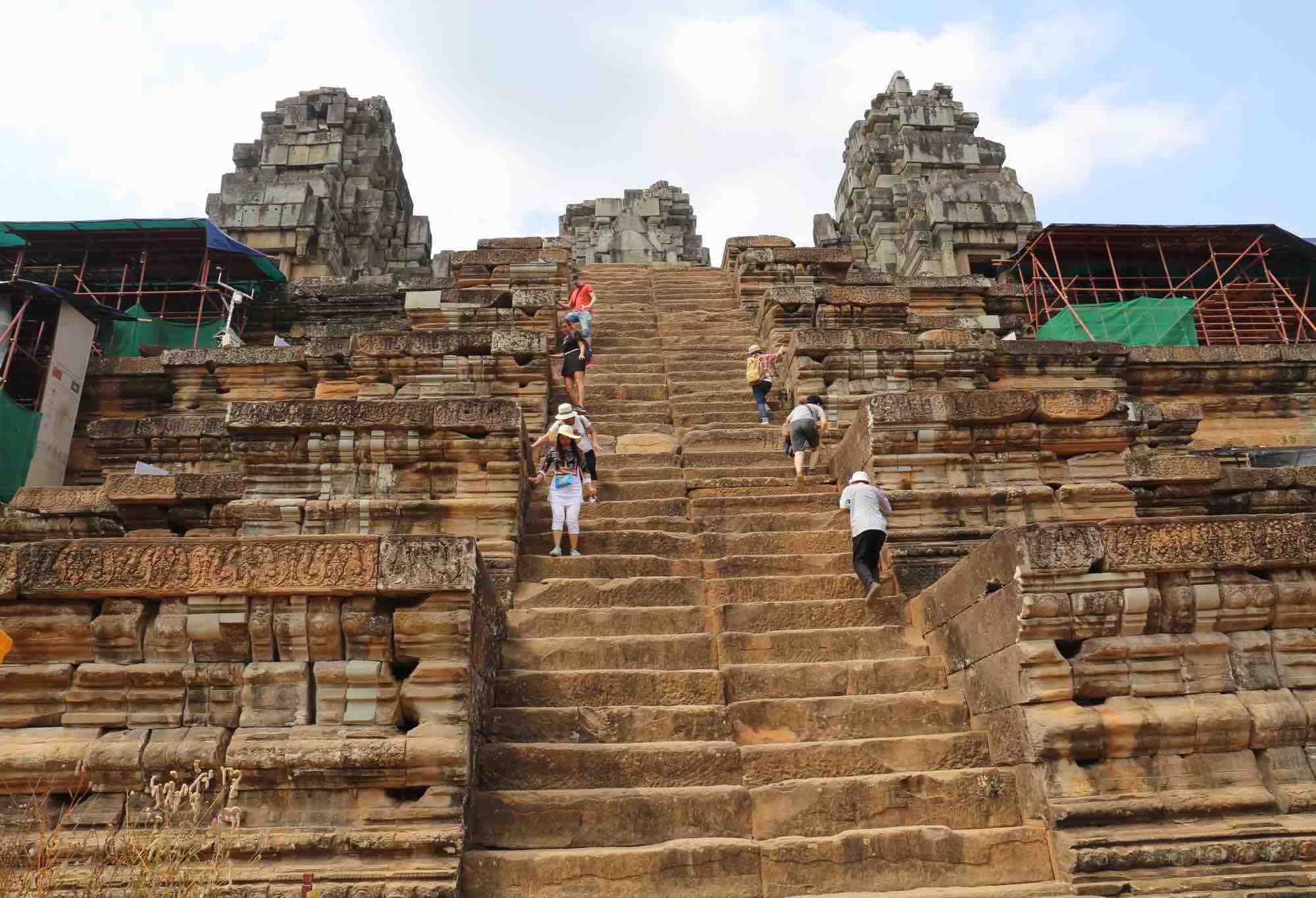 Ta Keo is older than Angkor Wat, having been begun in the 10th century. The temple is arranged in five vertical terraces to resemble Mount Meru, the home of the gods in Hindu beliefs. Climbing this temple is not for the faint of heart as the stairs ascend each of the four sides of each terrace, and “stairs” is a generous term on some of the levels. A restoration team has installed a steep staircase of wood on one side, so the first terrace is easier to ascend than it would have been when the temple was first completed. As you can see from the pictures, the restoration efforts are still ongoing. Ta Keo is a sandstone temple, the first of the Khmer temples to use this material.