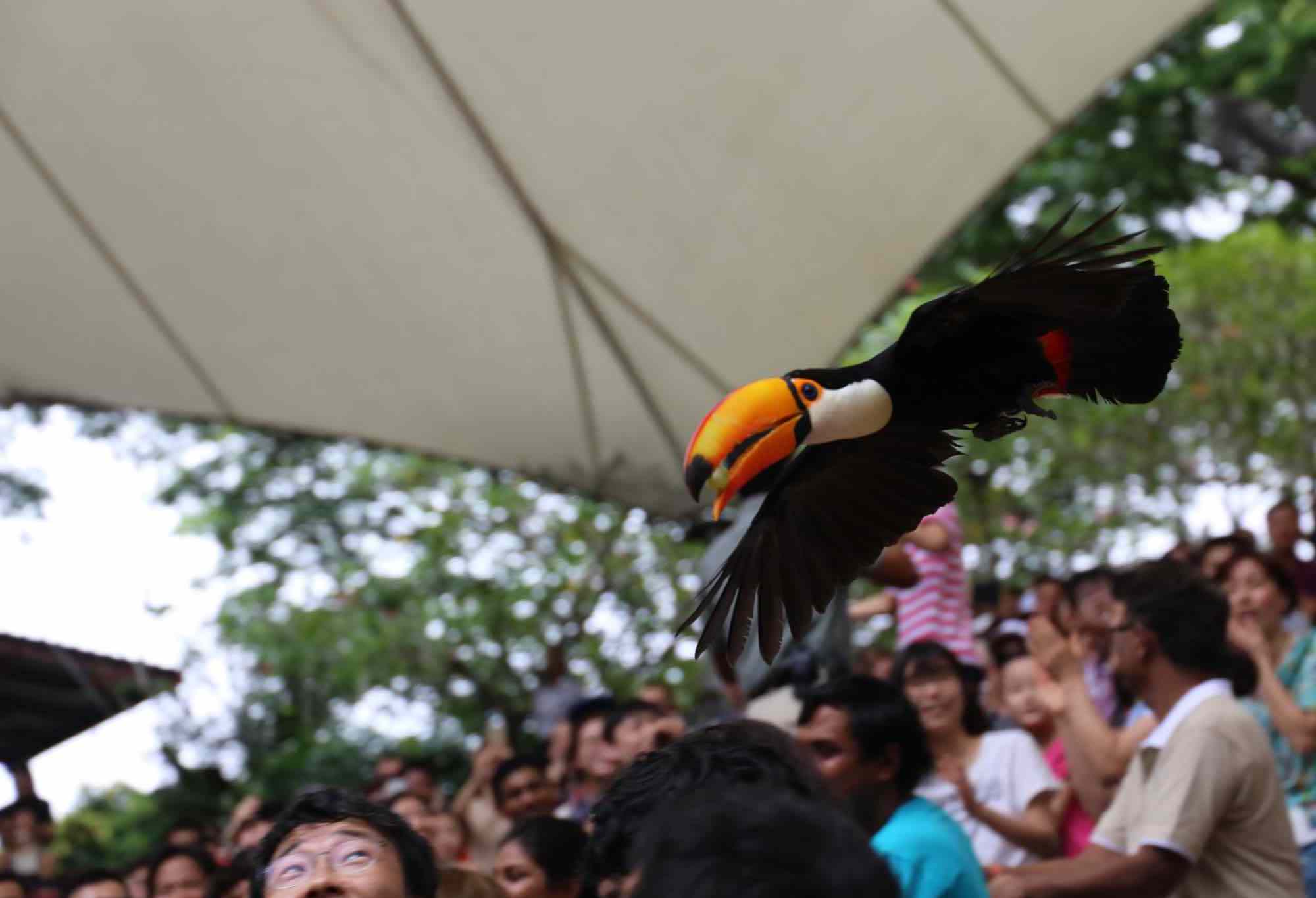 If you’ve been to a bird show at a zoo, the High Flyers show followed a similar setup. The trainer and host walked the audience through a number of segments that each focused on a different species of bird. Throughout the show, the audience was encouraged to participate: letting birds land on them, holding rings or rope on which the birds landed, and one lady donated S$2 to a particularly cheeky bird.