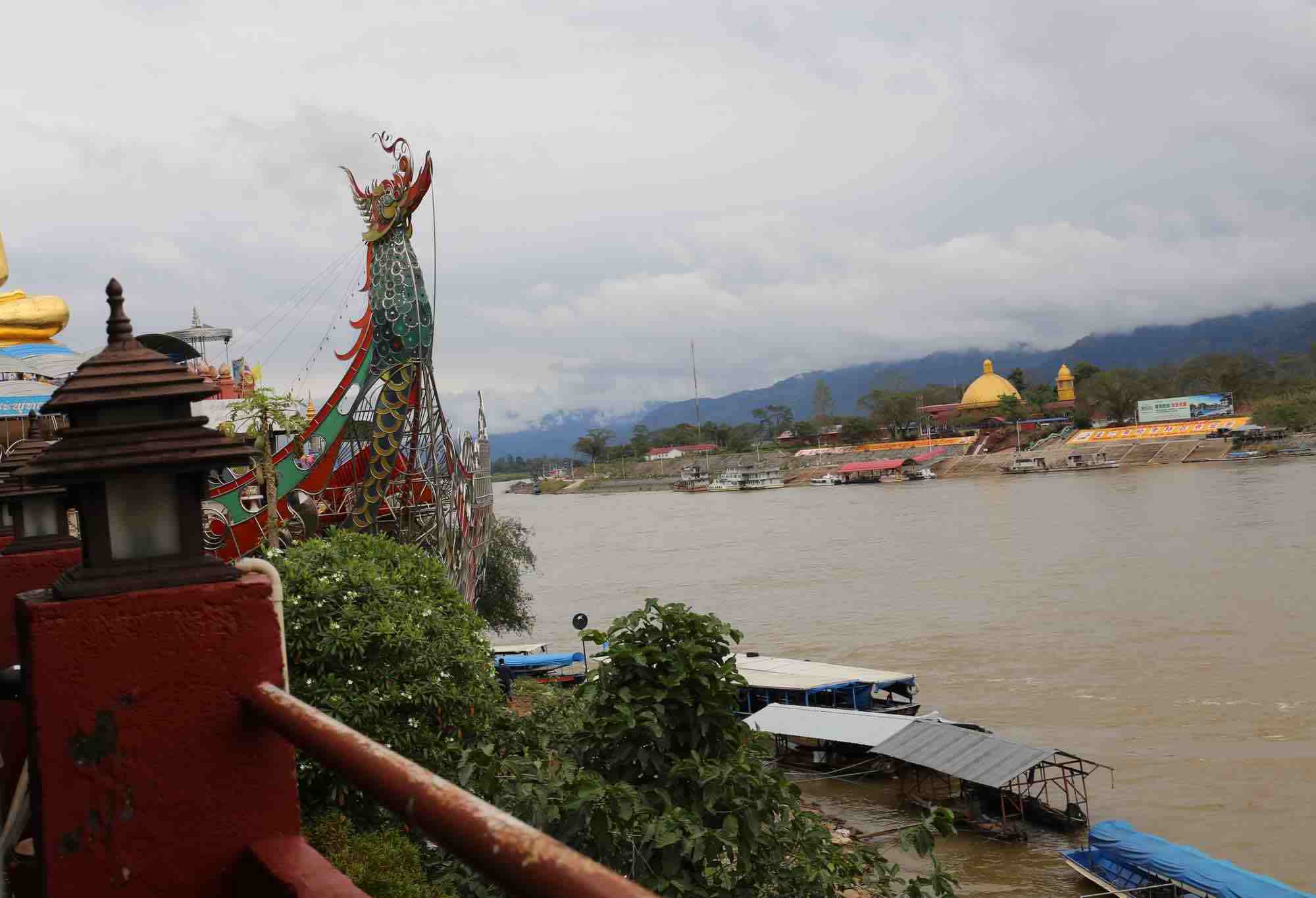 As we got underway, we saw the riverside for each of the countries in the Triangle and the river traffic. Boats move seafood and other goods from the Golden Triangle all the way to China along the Mekong. Motorboats zip law enforcement from all three countries up and down this section of the river. Except for a giant casino, most of the structures visible from the river reveal the overwhelming poverty of this region. After a 30-minute river tour, we put in at Dao Xian on the Lao side on a 30-minute visa. Tomorrow I will detail my bizarre visit there.