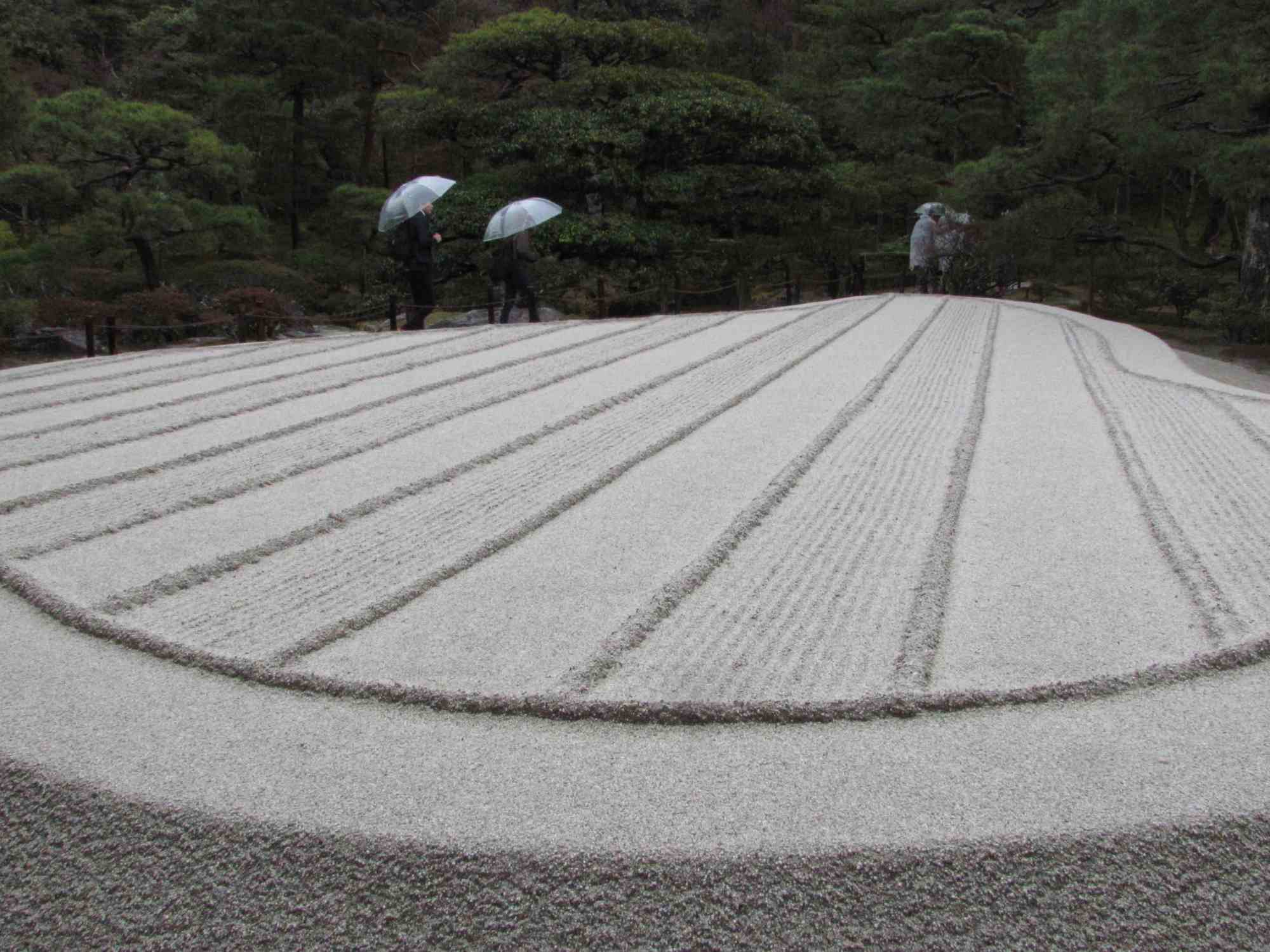 As I mentioned yesterday, my first day in Kyoto was fraught with bad timing and torrential downpours. But I was able to visit the breathtaking Ginkaku-ji Temple. This temple is known as the Temple of the Silver Pavilion or by its more formal name, Temple of Shining Mercy. However, as you can see from the pictures, there is no silver anywhere. The main kannon house, started in the late 15th century, was originally intended to be covered in silver foil, but this plan never materialized. The nickname stuck anyway. But the kannon house was the least interesting part of this site to me. It sits in the middle of one of the most remarkable gardens I’ve ever seen. Between the precisely raked sand, the lush mosses and the majestic trees, it’s hard to describe the tranquility this place embodies. Being there in the rain added another level of atmosphere to the place, making everything tangibly green. The gardens extend above the temple site onto a hillside, from the top of which you can see the whole city of Kyoto.