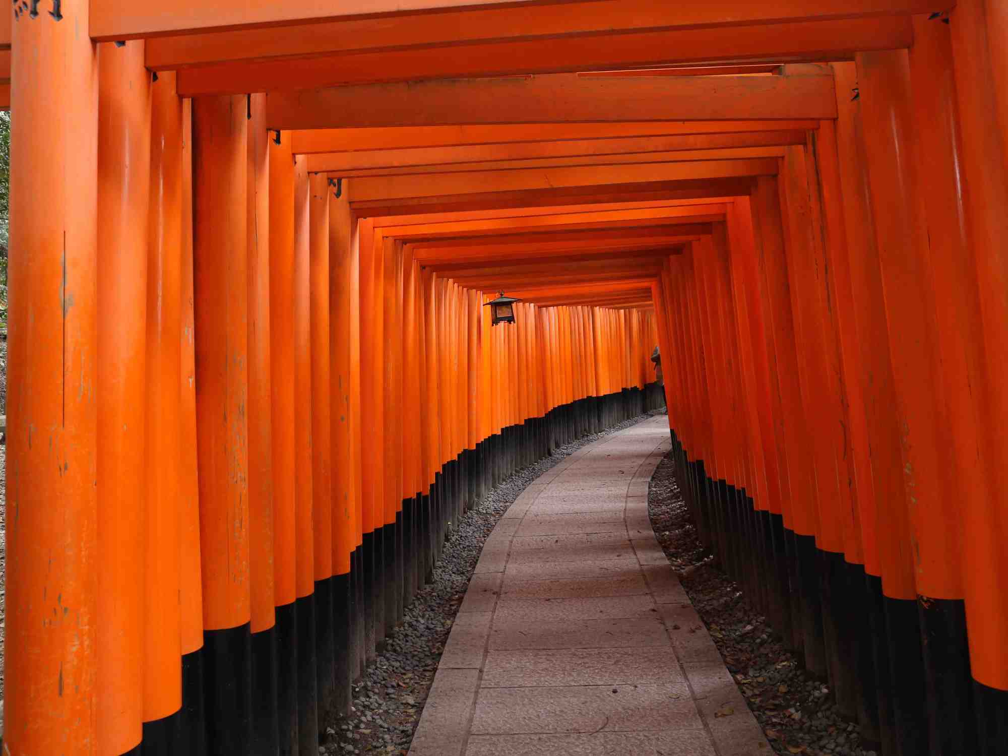From the first time I saw a photograph of the remarkable shrine at Fushimi Inari-Taisha, in a suburb of Kyoto, I wanted to see it for myself. The iconic orange gateways, torii in Japanese, that fill the site are hard to forget. The shrine is dedicated to Inari, the Shinto god of business and rice, and each tori is donated by a business to ensure blessings and good fortune for their endeavours. The temple was founded in 711 at the base of the mountain that shares the name of the god and shrine, Inari. His image is represented by a fox, which can be seen throughout the temple. In fact, visitors can offer their own fox ornaments as an offering.